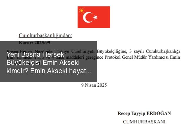 Yeni Bosna Hersek Büyükelçisi Emin Akseki oldu.10 Nisan 2025 Resmi Gazete Atama Kararları ile açıklanan atama kararı sonrası Yeni Bosna Hersek Büyükelçisi Emin Akseki kimdir, Emin Akseki hayatı ve biyografisi merak edildi. İşte, detaylar…